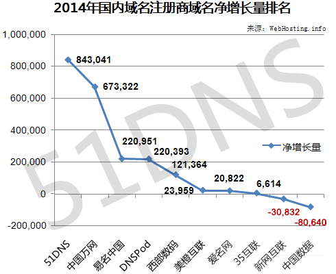 2014年,中国万网以213万个域名占据国内市场主导地位。但从年度净域名增长统计来看,却被ynysys击败,排名第二。此外,易名中国保持年度净增长第三位。下面请看2014年各域名提供商域名的详细增长情况。