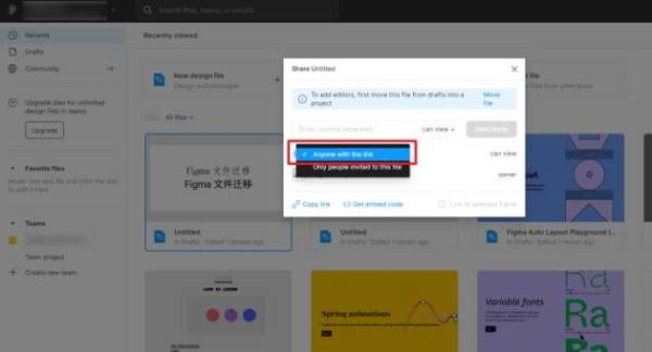 授权之后,打开 Figma 工作台,将想导出的 Figma 文件的分享权限设置为 Anyone with the link 。