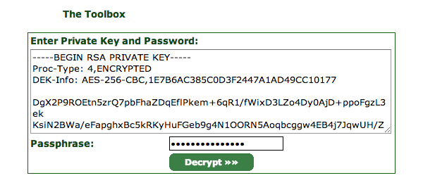解密秘钥 在使用证书证书之前还需要对生成的秘钥解密,可使用命令openssl rsa -in ssl.key -out ssl_decrypted.key,或者是StartSSL提供的工具: Tool Box - Decrypt Private Key,生成的内容另存为文件,如ssl_decrypted.key。