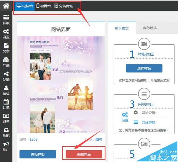 第四 、样板安装完成之后,选择“电脑网站 ”或“微官网”抑或“分销商城 ”,点击“编辑界面”, 进行编辑。