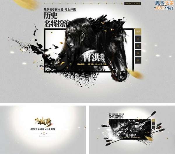如:刀锋铁骑品牌站,采用黑金两色,将这款冷战争网游,用最简单的方式表现最纯粹的视觉,更加有感染力。