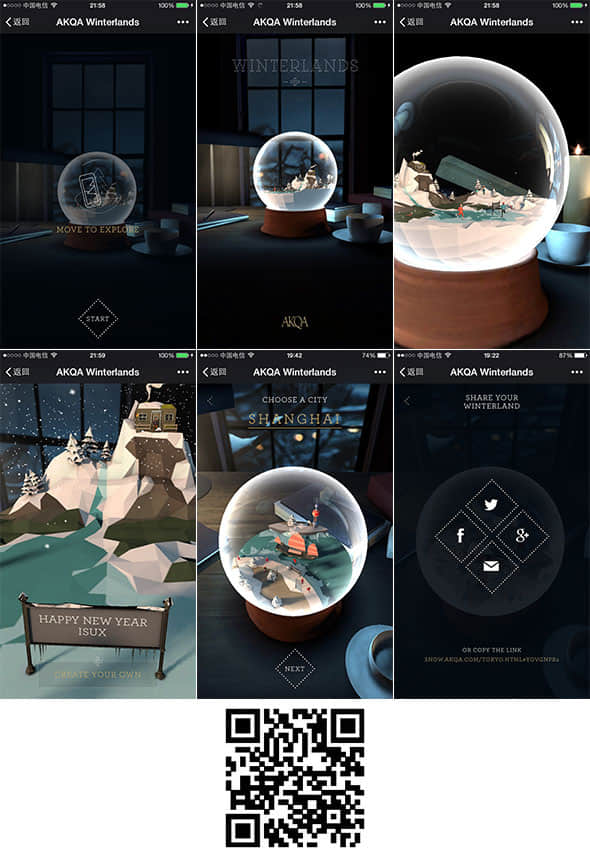 AKQA创意营销公司在圣诞之际献上了一份厚礼——梦幻水晶球。通过移动手机,镜头从水晶球外不断摇晃推近,渐渐走进水晶球的微观世界里。通过手机环顾四周,可以360度欣赏水晶球里的全景,摇一摇雪花便漫天飘洒。写下你的祝福并分享给朋友,相信一定会惊艳到对方。这个H5页面使用了重力感应、3D等技术,文字与BGM的使用也十分讲究,给用户带来了完美的互动体验,值得细细品味。