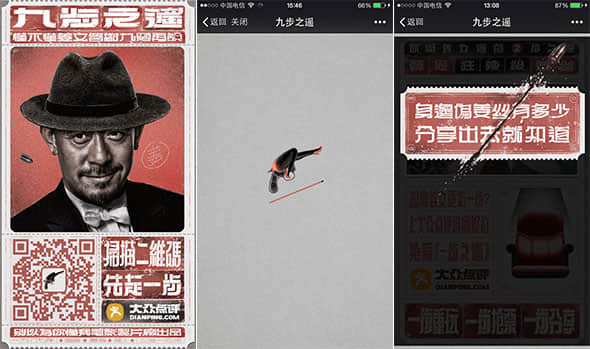 大众点评姜文电影推广系列的《九步之遥》H5专题页便牢牢抓住了这一点。从二维码入口到性感的loading页,再到最后分享提示的设计,包括文案措辞和背景音效,无不与整体的戏虐风保持一致,给到用户一个完整统一的互动体验。